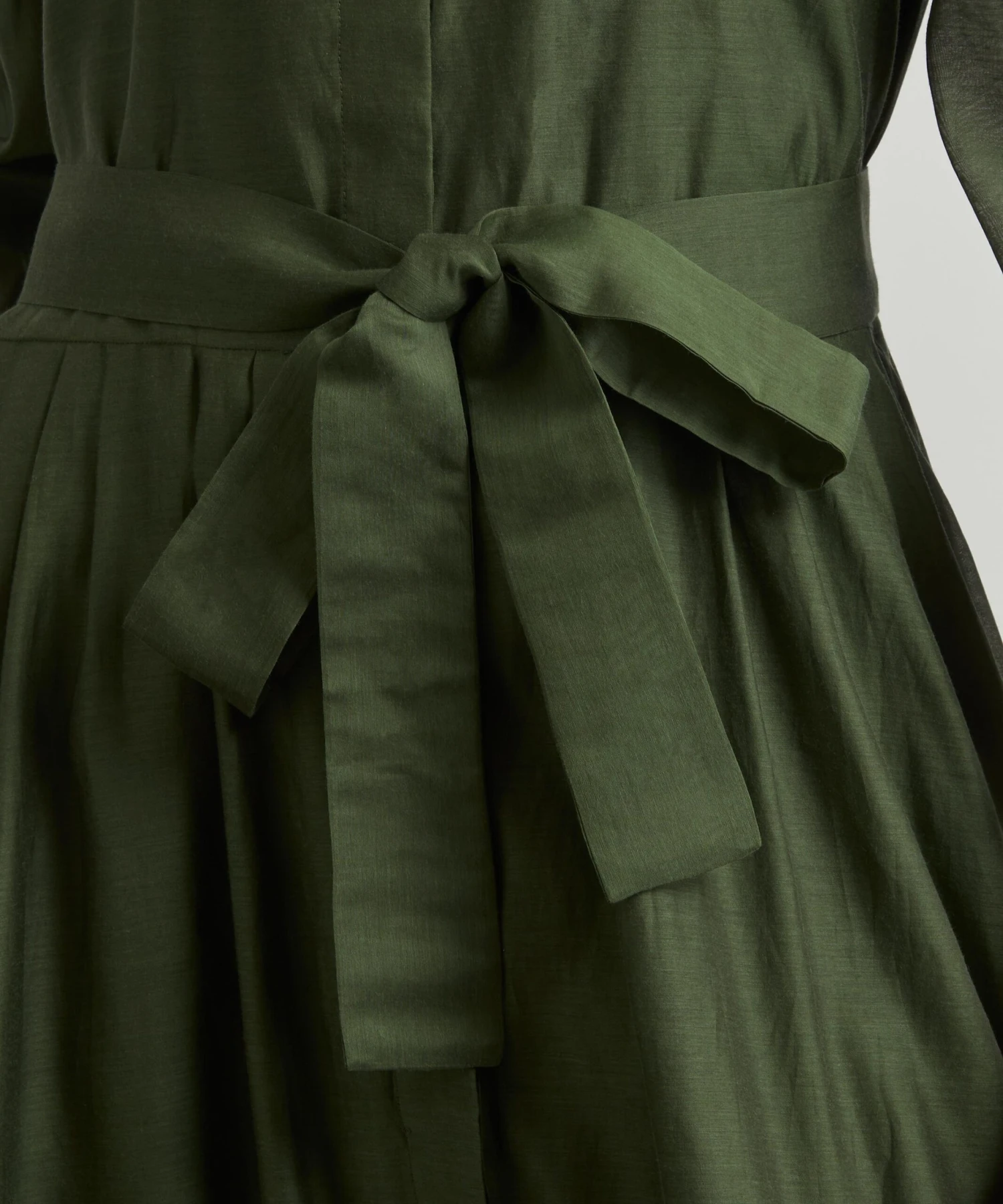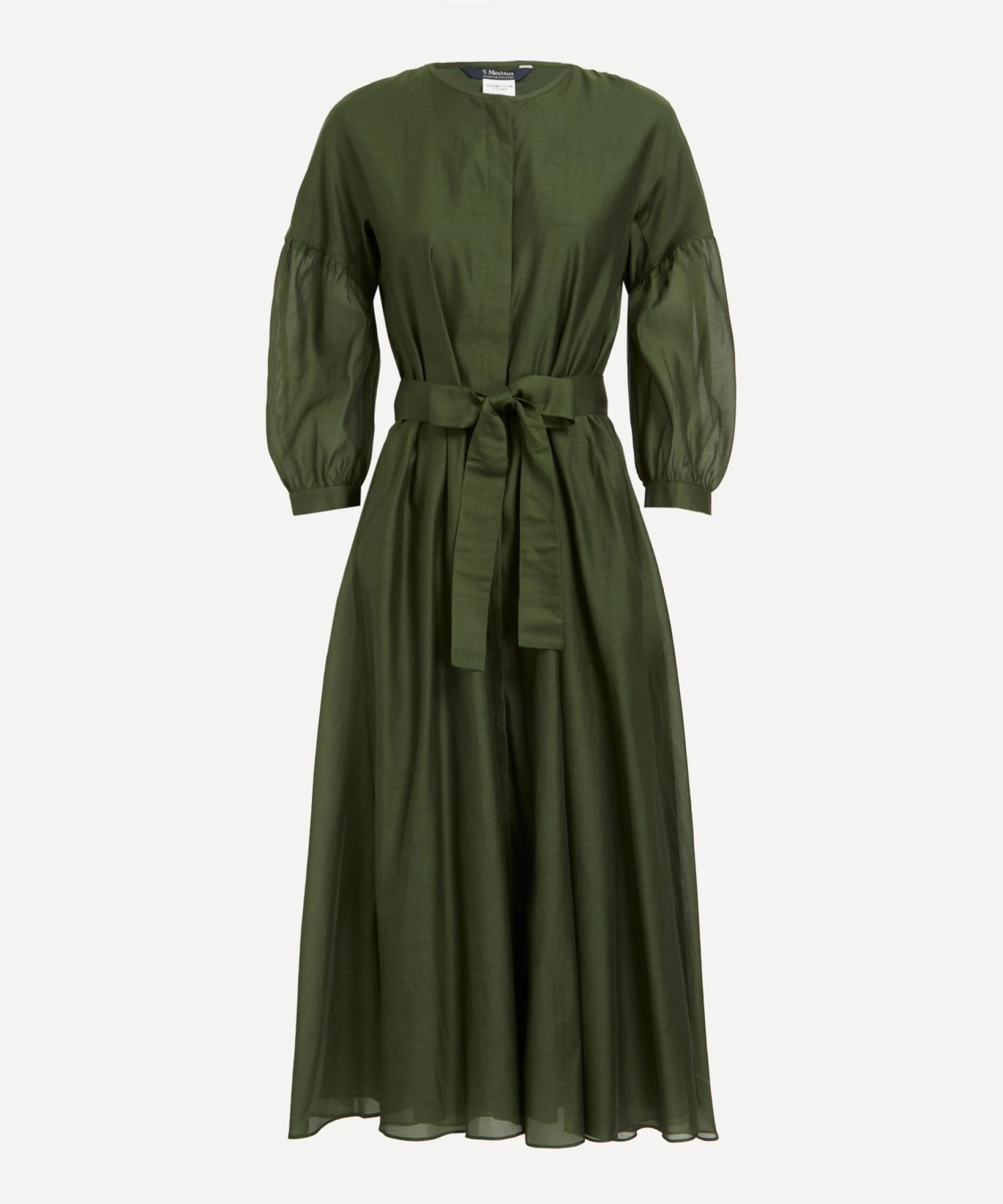 Lightweight and loose with its dropped shoulders, pleated balloon-sleeves and flowy, mid-length skirt, this semi-sheer khaki dress features a flattering round neckline, concealed buttoned closure and a detachable belt for an accentuated waistline.