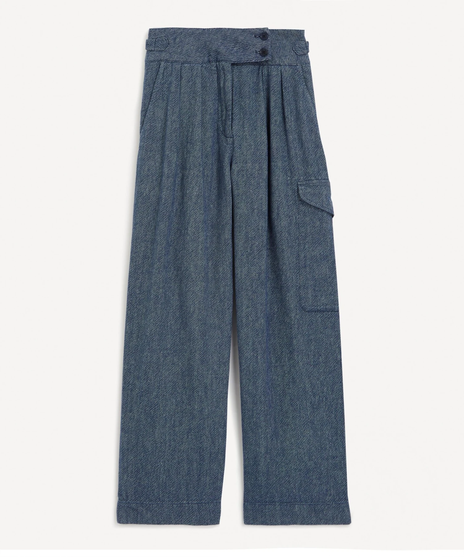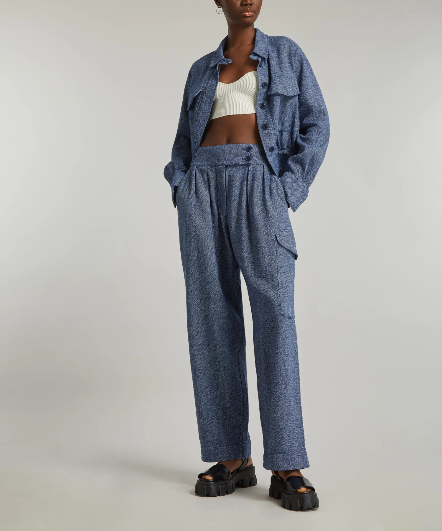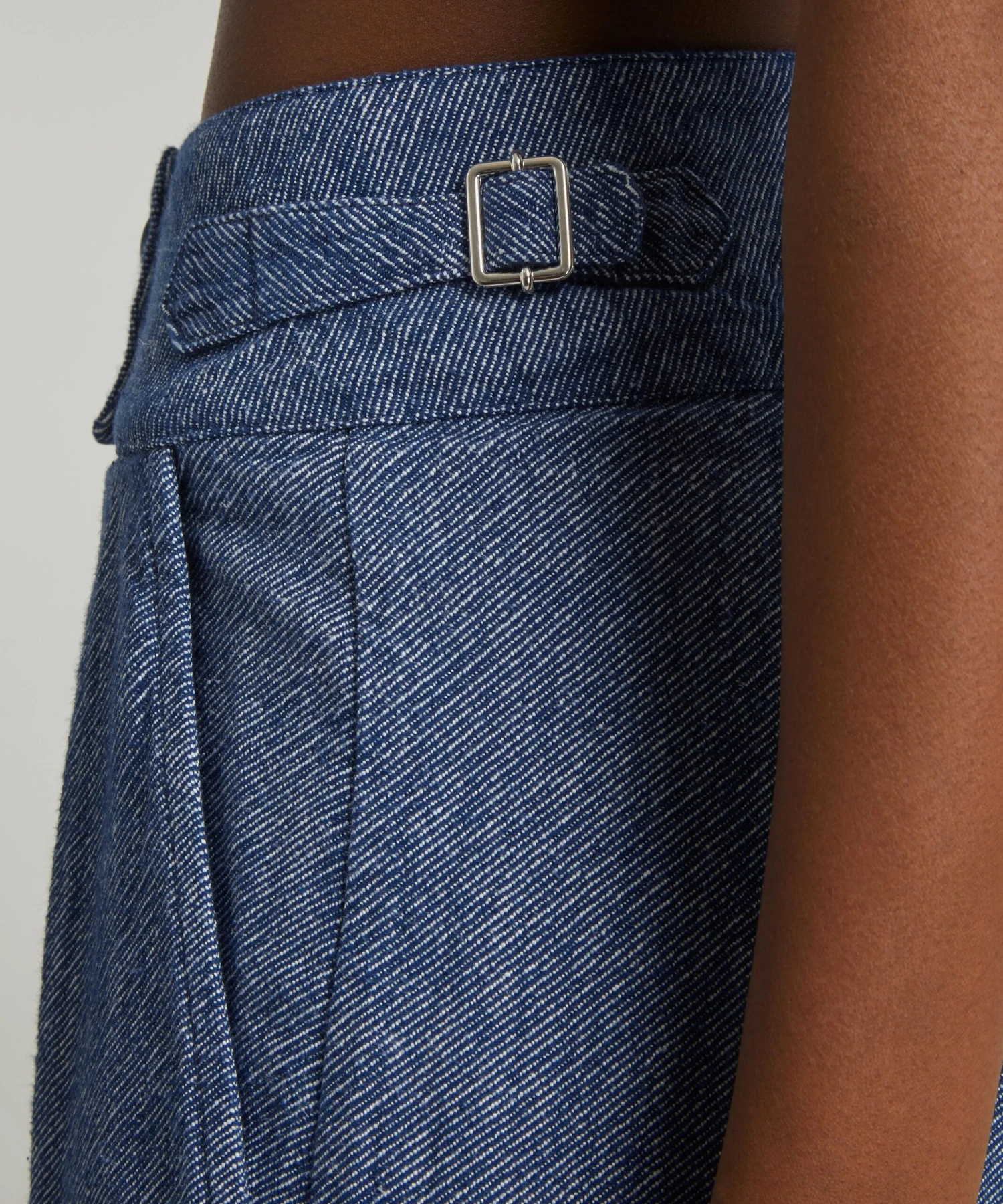 Crafted from an Italian linen and cotton twill for a high-rise, loose leg silhouette, this pleated pair features a large flap pocket at the side, and a wide waistband complete with adjustable buckle tabs for an authentic utilitarian finish.