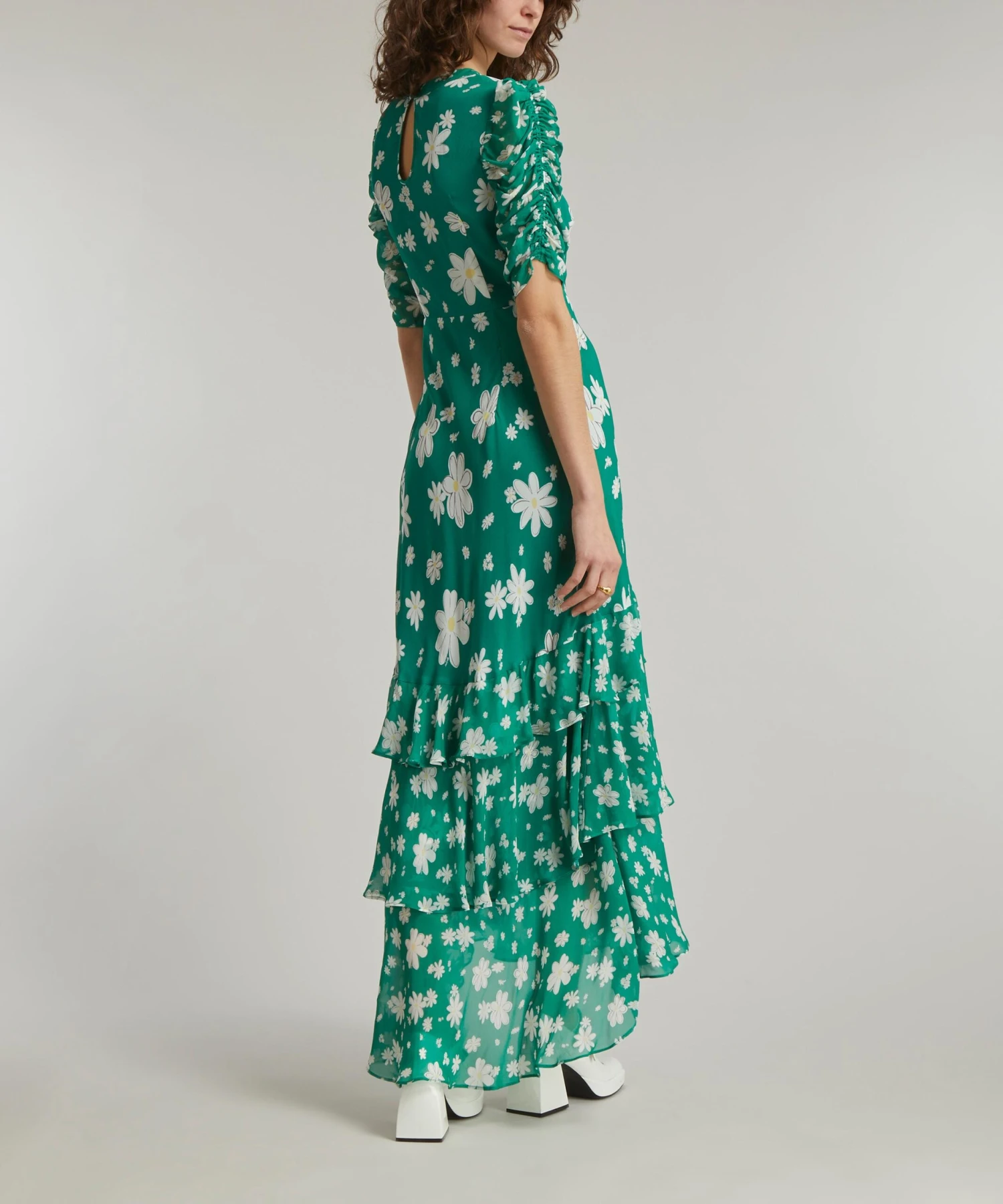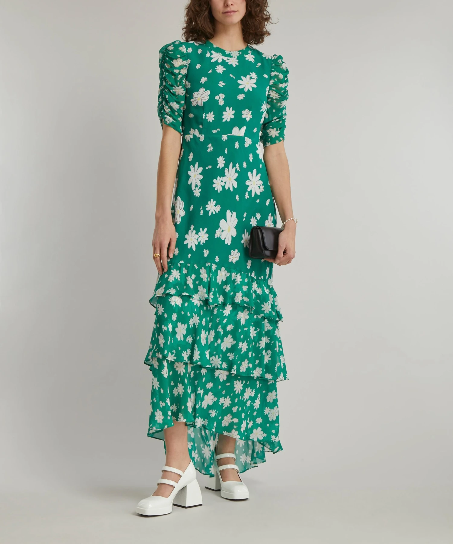 Effortlessly feminine with daring vintage appeal, the Evelyn dress from RIXO embraces the brand’s contemporary take on classic silhouettes. Featuring a green, retro-inspired daisy print throughout, this floaty floral midi-dress is effortlessly elegant with its ruffled bias-cut skirt and statement short-ruched-sleeves.