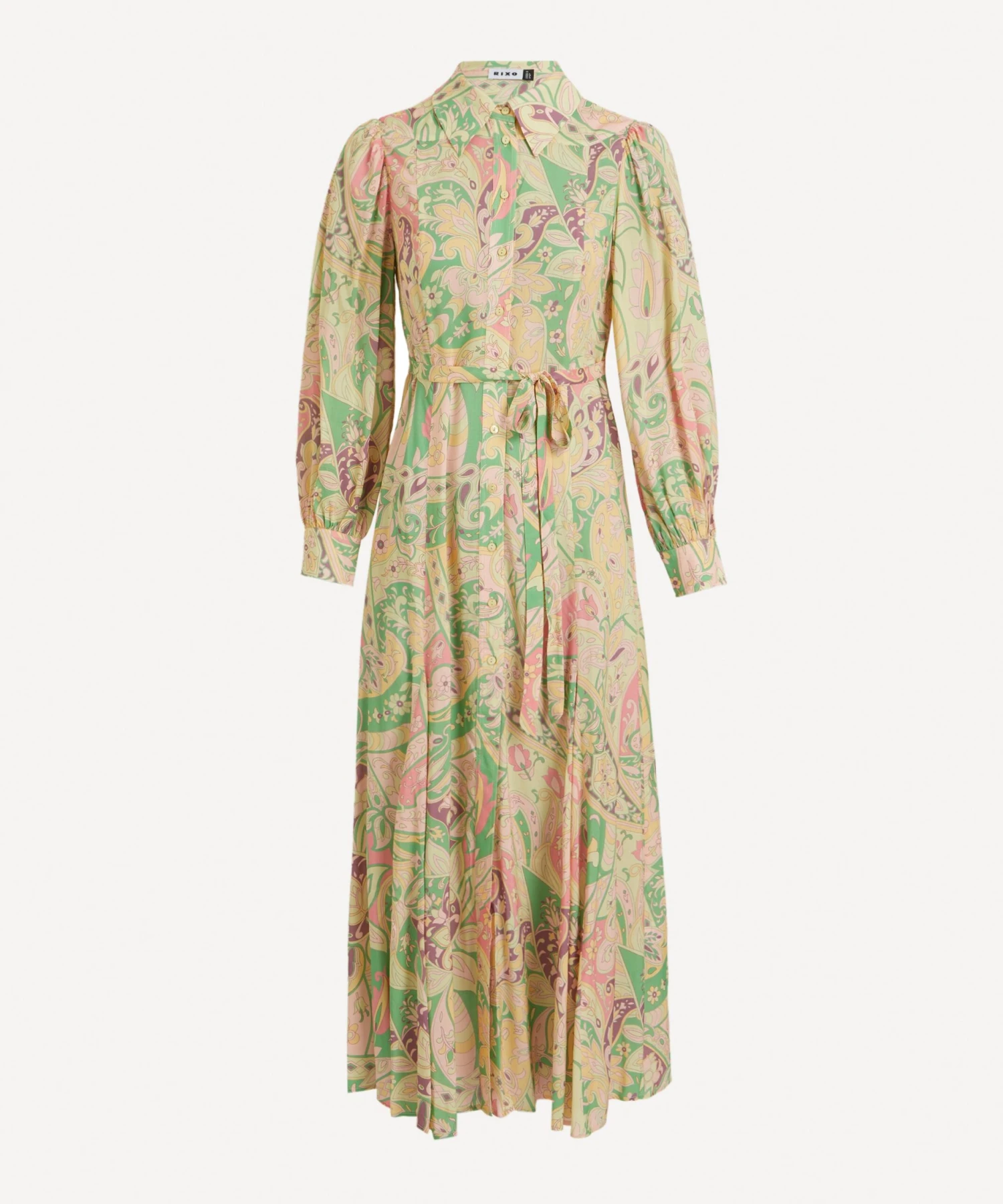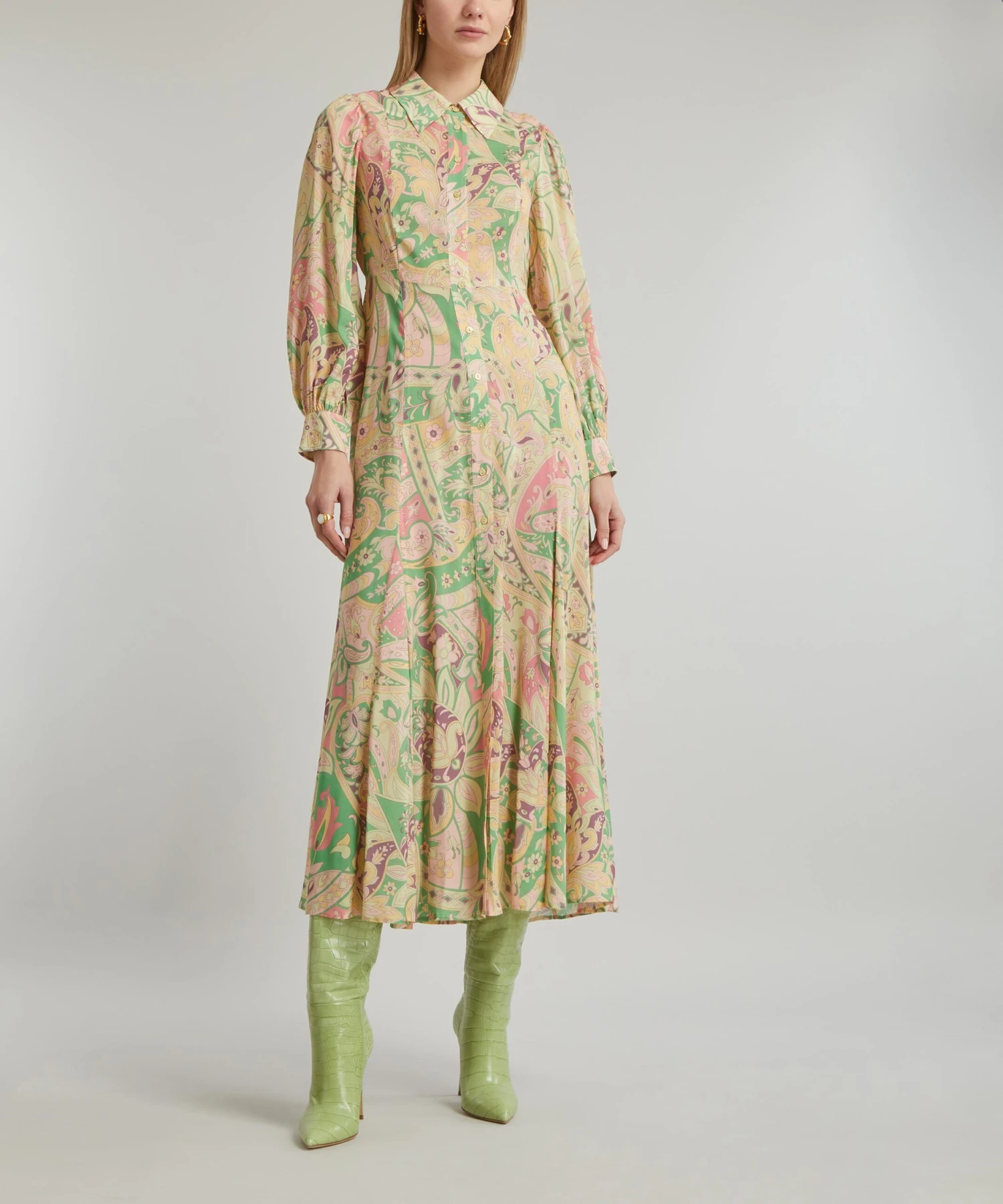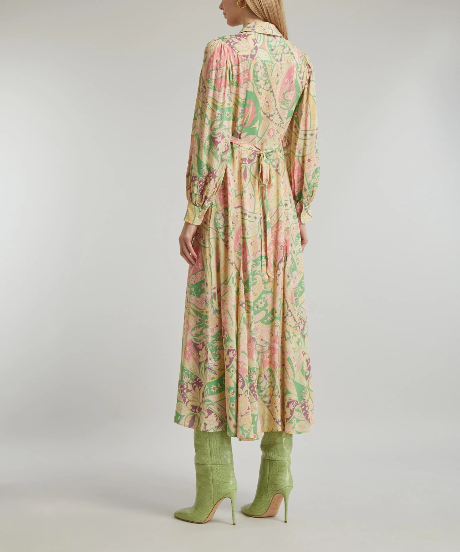 Adorned all-over in a green and pink paisley print inspired by Grace Kelly, the Georgina shirtdress from RIXO embraces the brand’s contemporary take on classic silhouettes. Lightweight and loose with its voluminous bell-sleeves and flared hemline, it has a shirt-style collar and an elongating, full-length buttoned closure for a tailored finish.