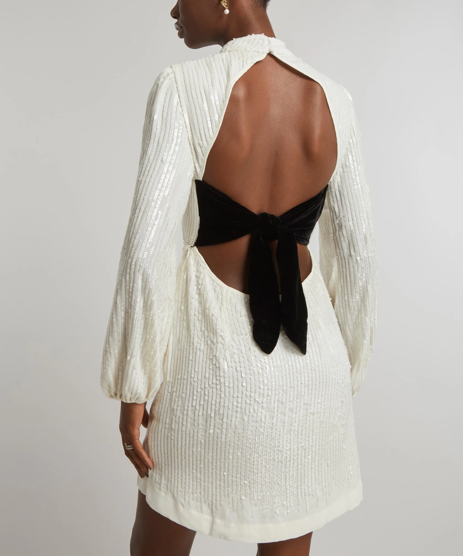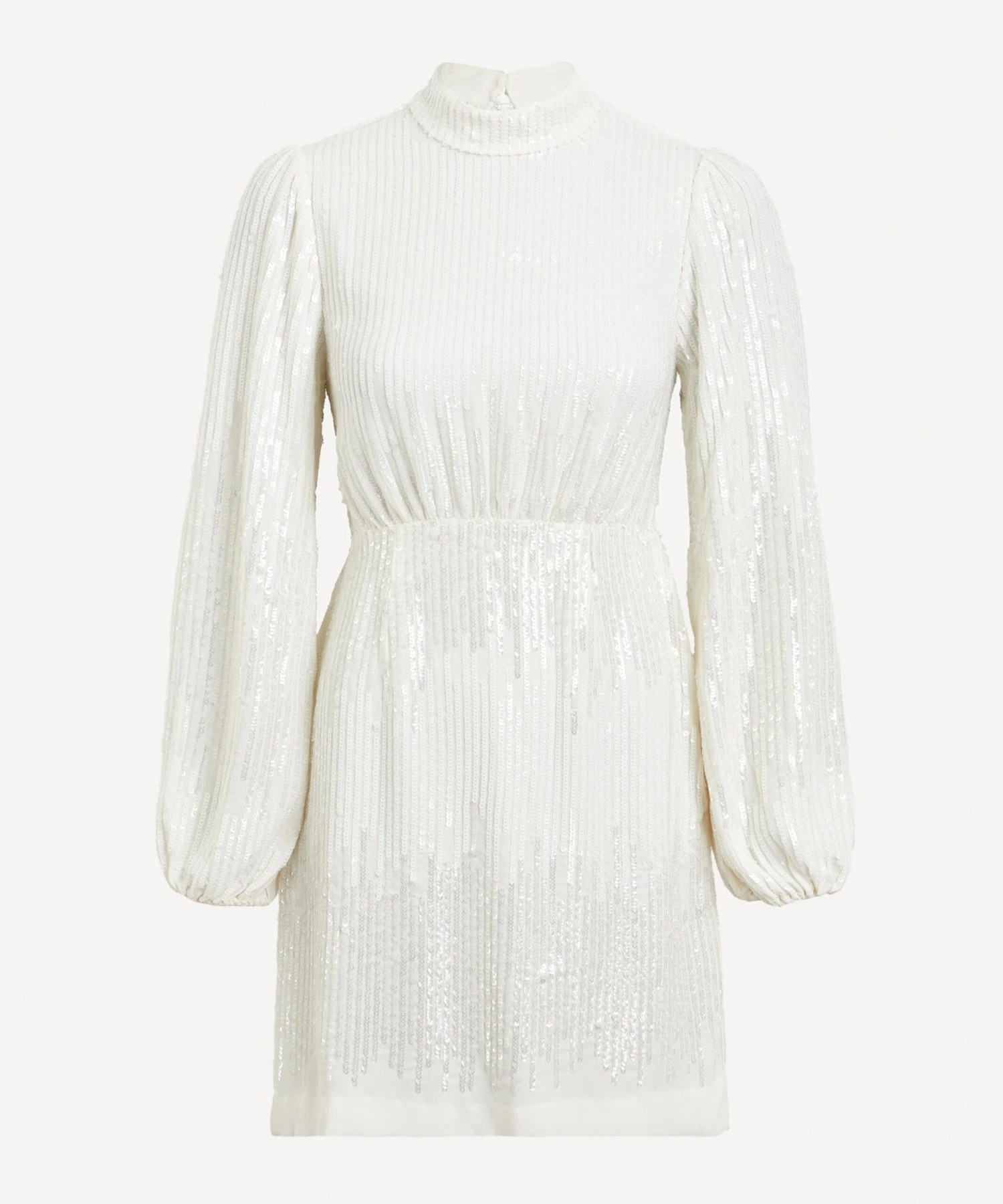 Effortlessly flattering and feminine, RIXO’s vintage-inspired bridal styles look as beautiful in antique frames as they do on Instagram – the Lara dress is no exception. Add a touch of sparkle to your special day with this sequinned mini-dress, featuring a high-neckline, voluminous bouffant sleeves and a statement-making, open-back complete with black velvet ties. A polished and playful design, it’s perfect for dancing the night away in.
