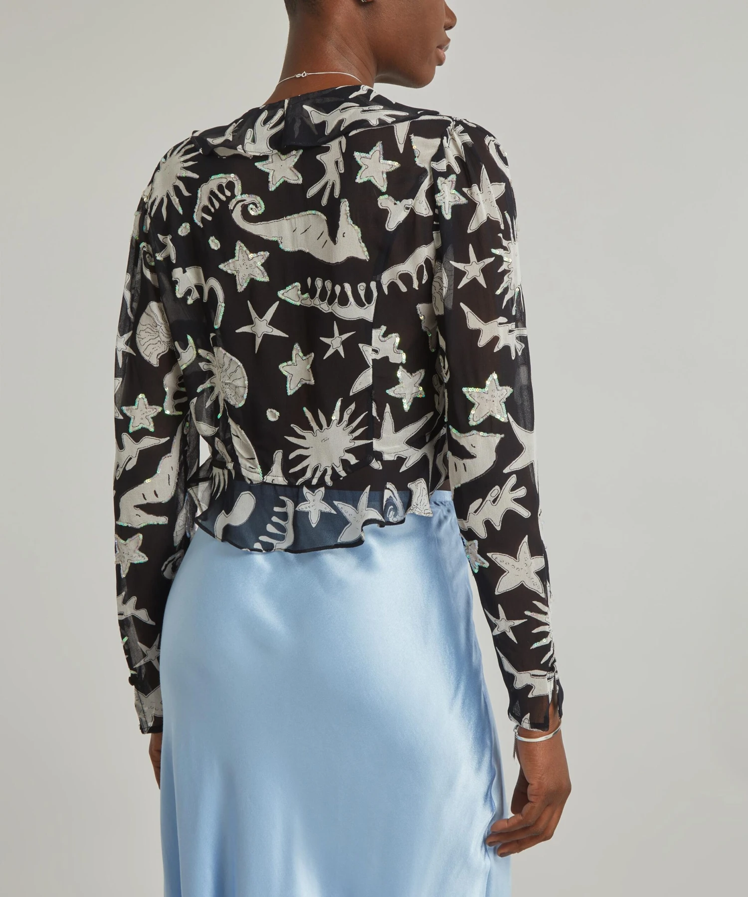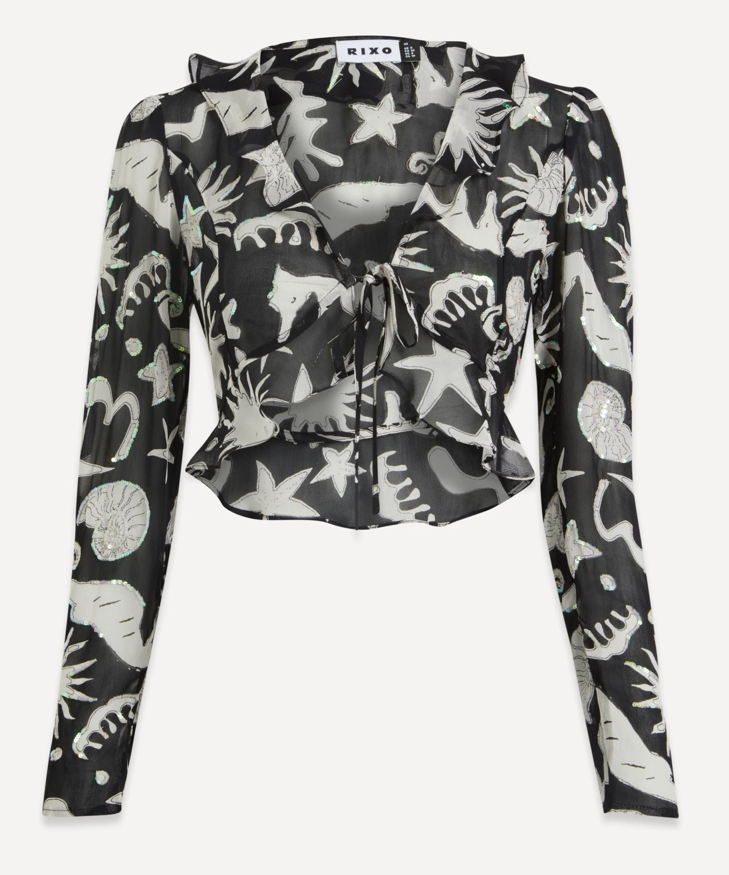 Awash with vintage appeal, the Neelu Tie-Front blouse from RIXO embraces the brand’s contemporary take on classic styles. Showcasing the hand-painted, sequin-embellished Ocean Black pattern, this semi-sheer shrug-style top features a plunging V-neckline and a flouncy, lettuce-frill shawl-collar and hem for an feminine finish.