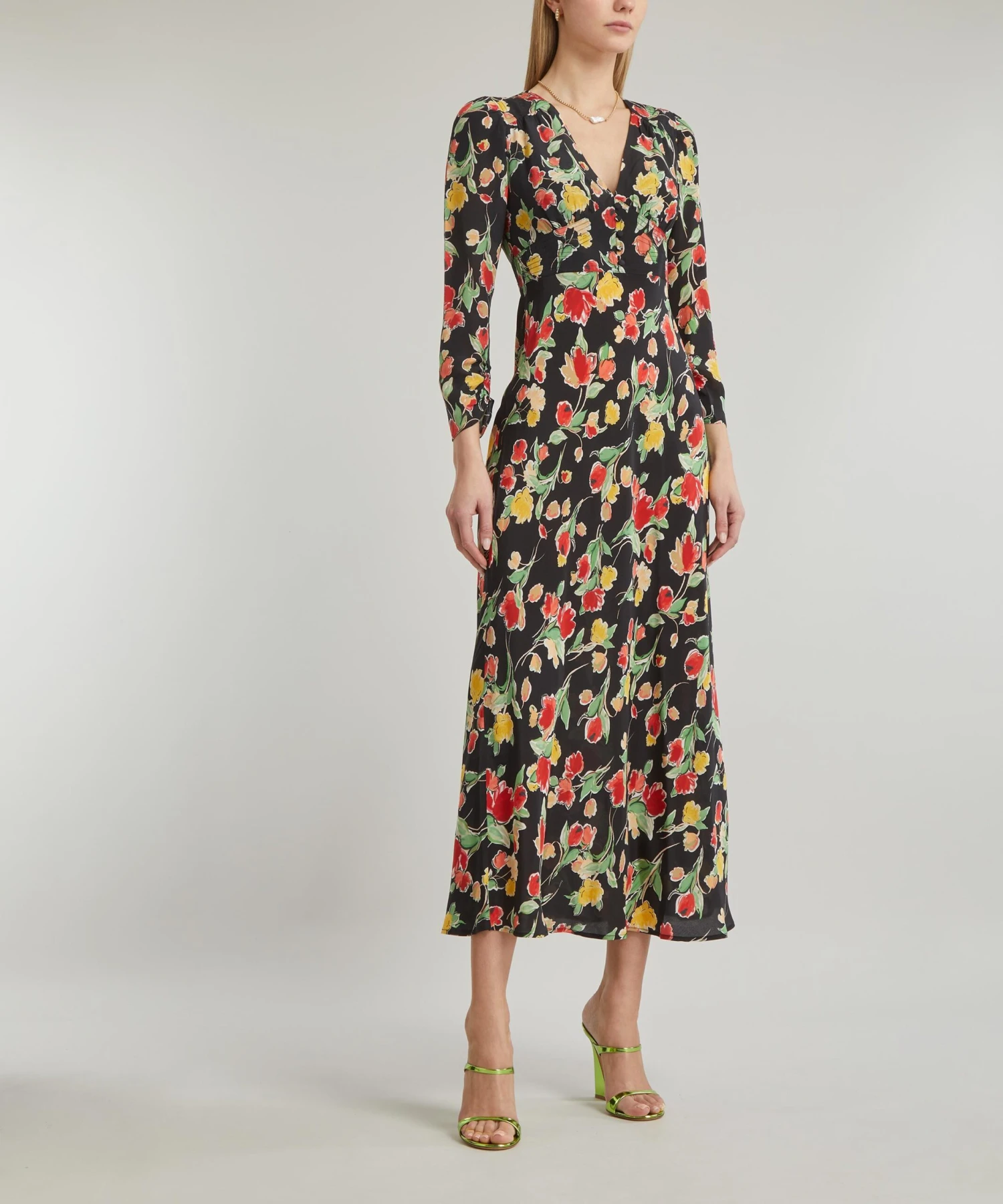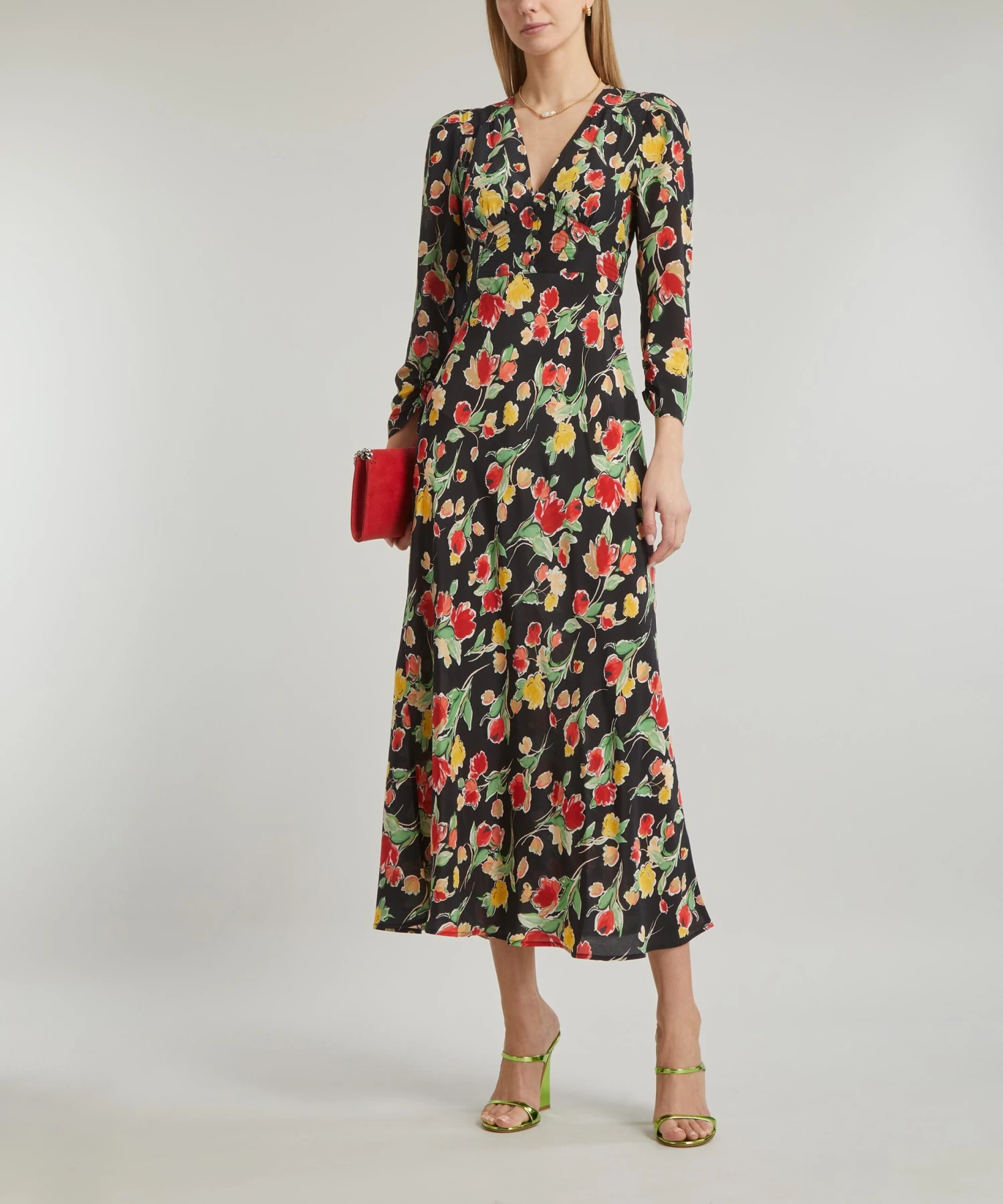 Blooming with vintage appeal, the Selma dress from RIXO embraces the brand’s contemporary take on classic styles. Crafted from silk crepe-de-chine showcasing the charming Fontainhas Floral pattern, it features an elegant V-neckline, slim sleeves with ruched cuffs and an empire waistline that falls to a loose, bias-cut skirt for a flowy finish.