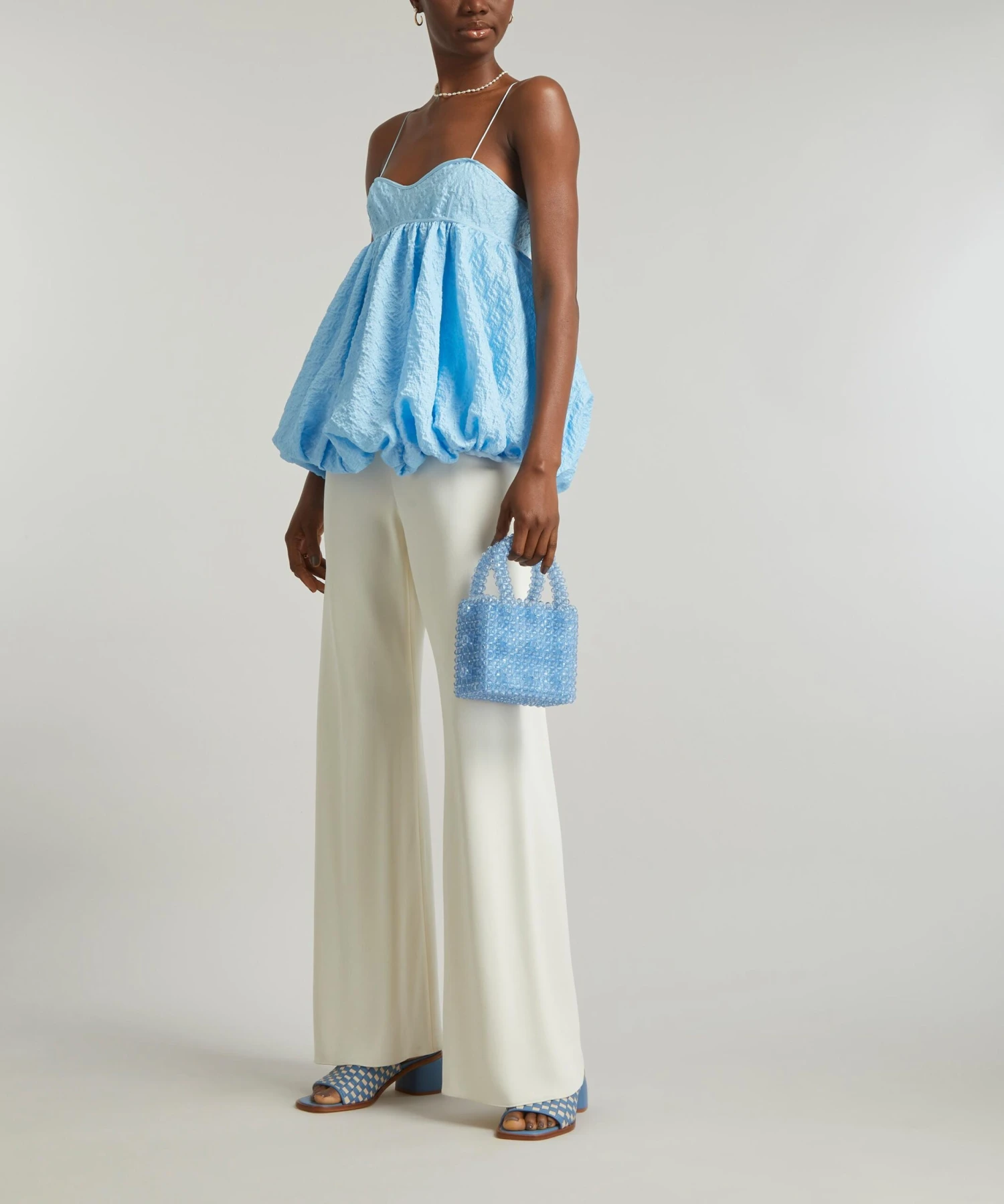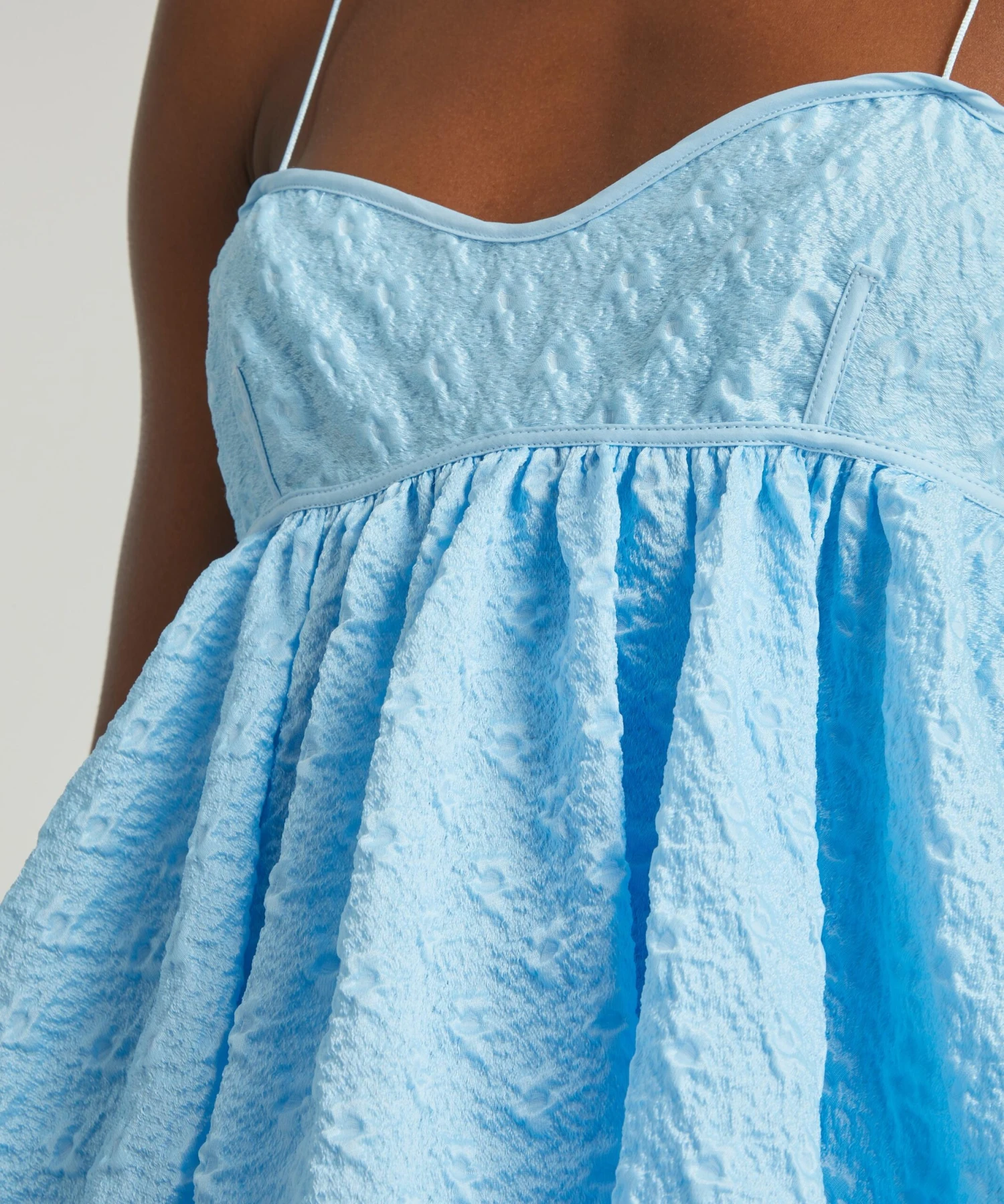 The Shea top from Cecilie Bahnsen embodies the designer’s alluring aesthetic for whimsical silhouettes with a sculptural edge. A studied take on feminine volume, it’s crafted from sky-blue Bolsillo Matelassé and features a strappy bustier that falls to a flared, bubble-effect hem.