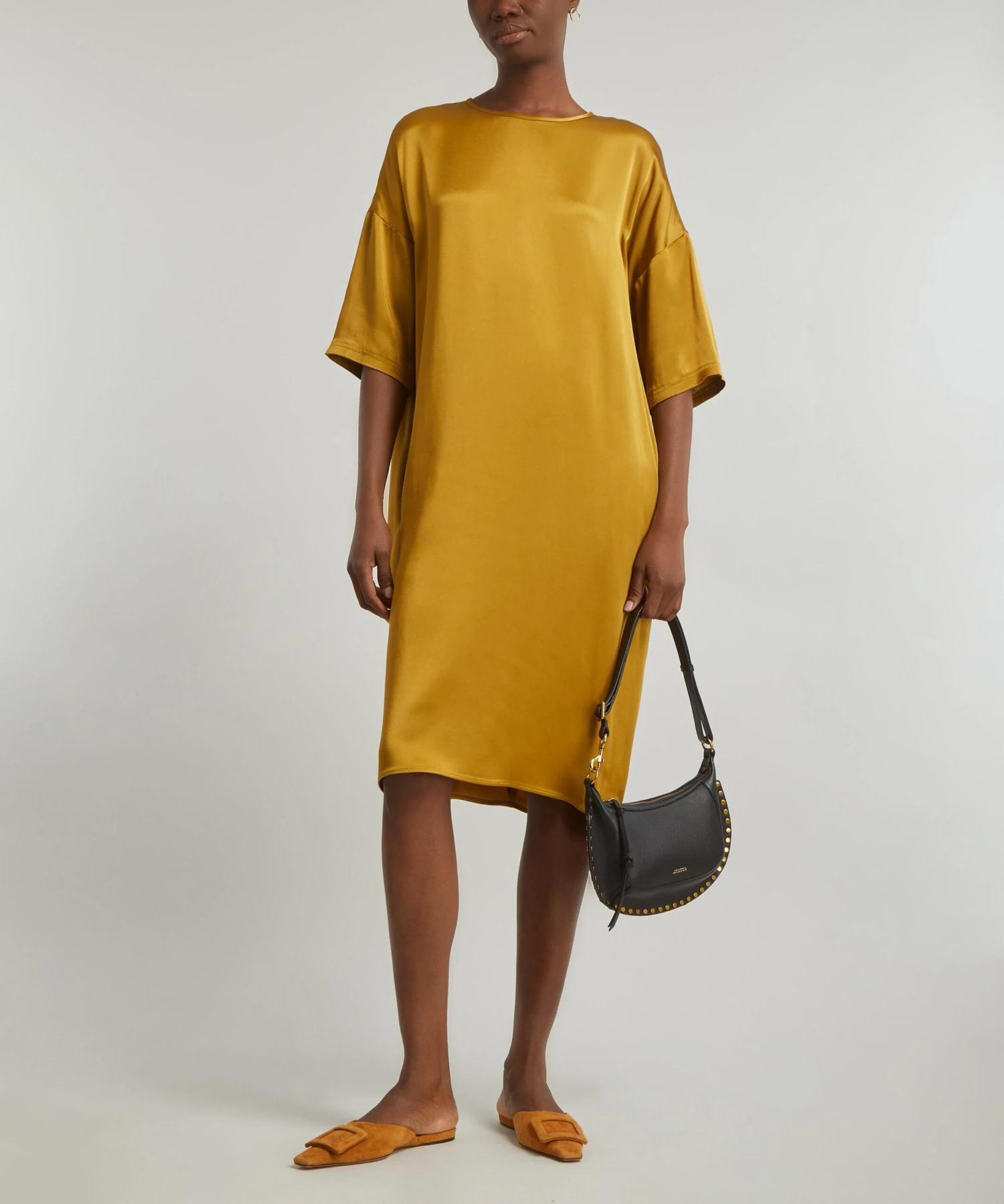 Crafted from a viscose-blend satin fabric for a relaxed fit with dropped shoulders and low, set-in sleeves, this ochre-yellow dress features side-seam pockets for a practical finish touch.